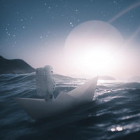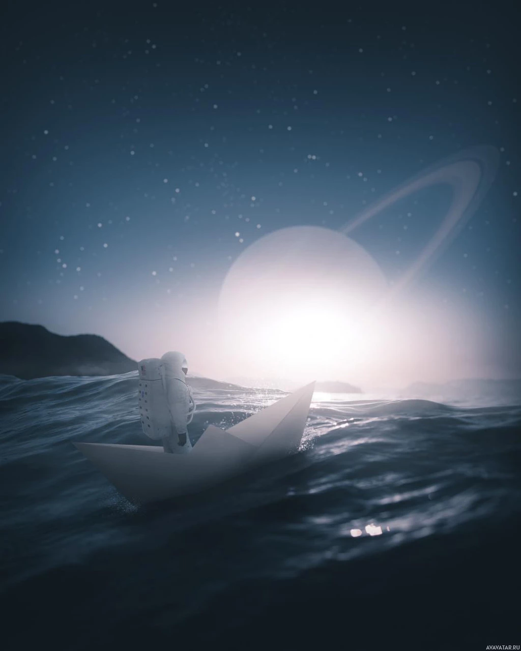 a space suit and is looking down at what appears to be a small boat on the ocean below. The lighting suggests it might be late evening or nighttime. The overall scene combines elements of reality (the Earth and moon) with fantastical components (