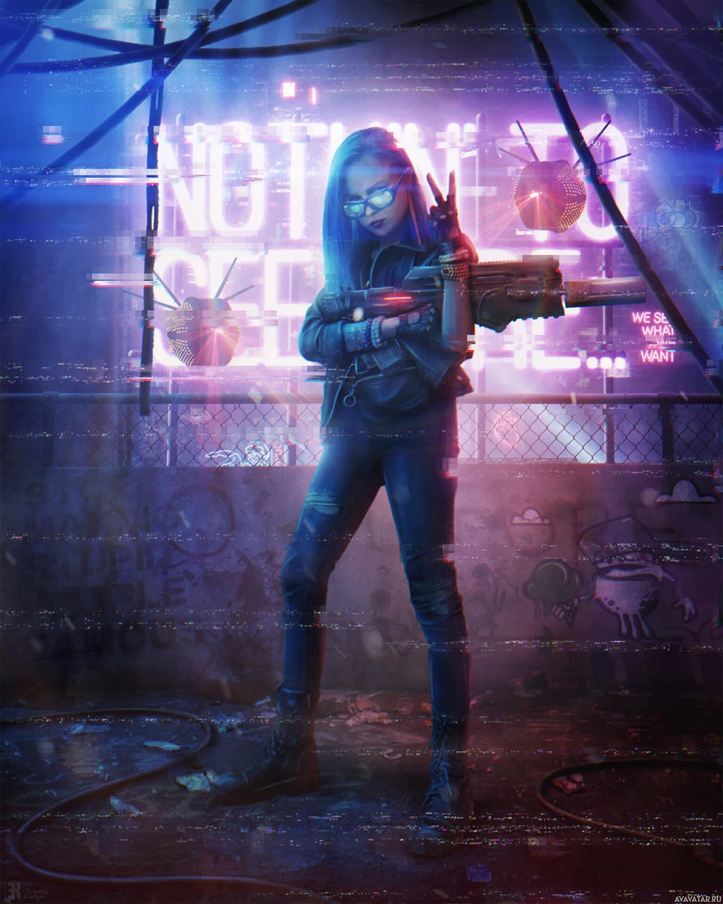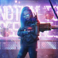 neon signs, suggesting a dystopian or cyberpunk environment. There are