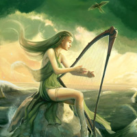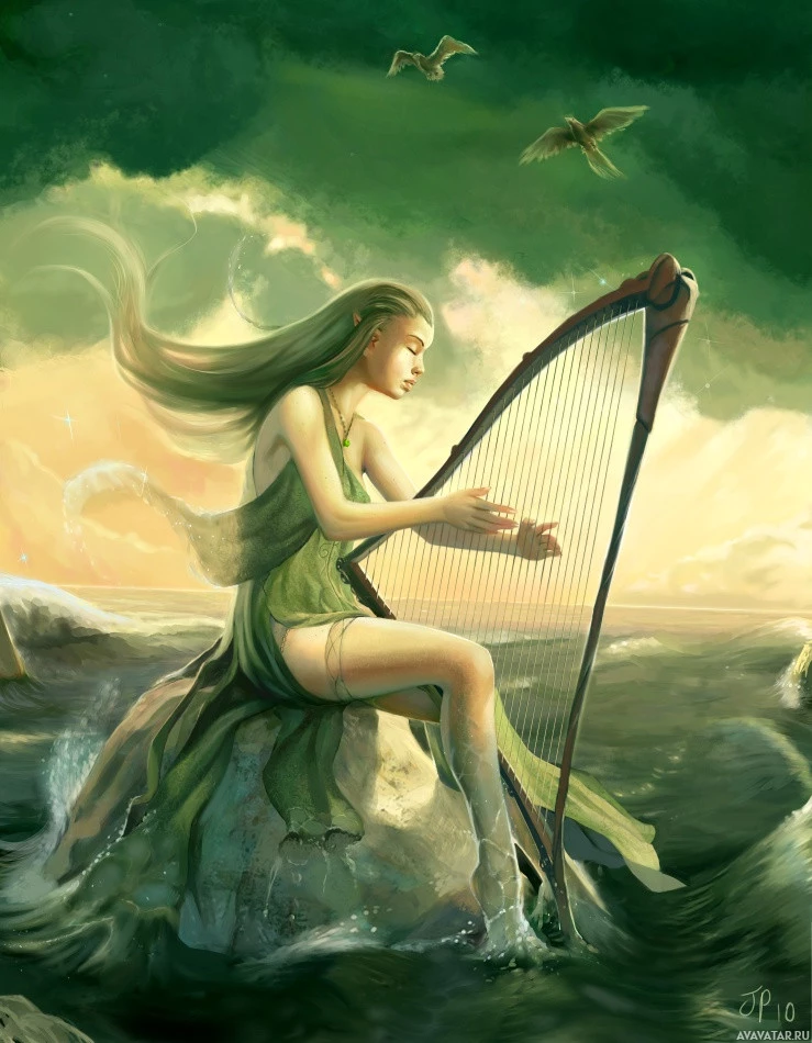 a fantasy scene with an elf-like figure sitting on a rock in the ocean. She appears to be playing a harp, which is