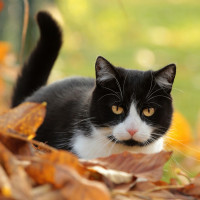 На картинке изображена черно-белая кошка, стоящая среди опавших листьев. Глаза кошки широко открыты, придавая ей настороженный или удивленный вид. Обстановка предполагает, что это может быть осенний или осенний сезон из-за красочных листьев на земле.