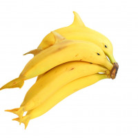 The image shows three bananas shaped like dolphins. They have been creatively arranged to resemble the bodies of dolphins, with the stems serving as the fins or tails. This playful presentation is designed to be fun and imaginative, combining fruit with a marine animal theme.