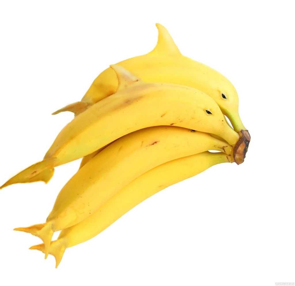 На снимке изображены три банана в форме дельфинов. Они были творчески организованы, чтобы напоминать тела дельфинов, а стебли служили плавниками или хвостами. Эта игровая презентация призвана быть веселой и творческой, сочетая фрукты с темой морских животных.