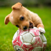 На картинке изображен маленький щенок, играющий с футбольным мячом. Собака держит мяч в пасти и, похоже, жует его, возможно, играя или прорезывая зубы. Эту фотографию можно охарактеризовать как содержащую элементы "животное", "собака" и "мяч".