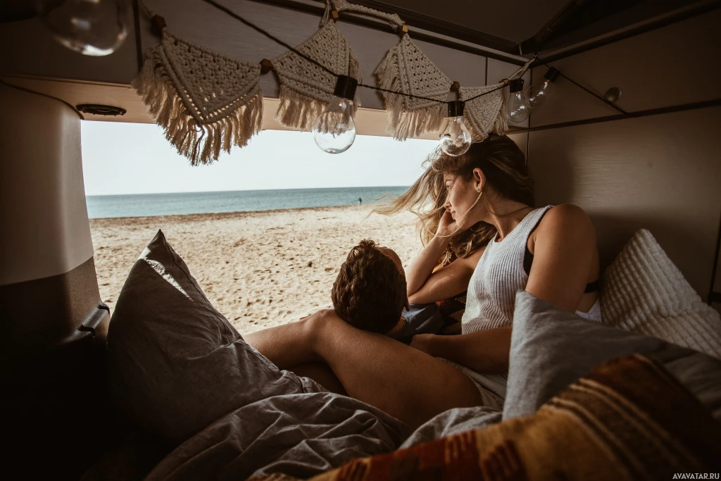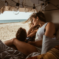a scenic view of a beachfront location, indicating that they might be near the coast. The atmosphere suggests a romantic or intimate moment shared between the two individuals. There are textiles like pillows and blankets visible in