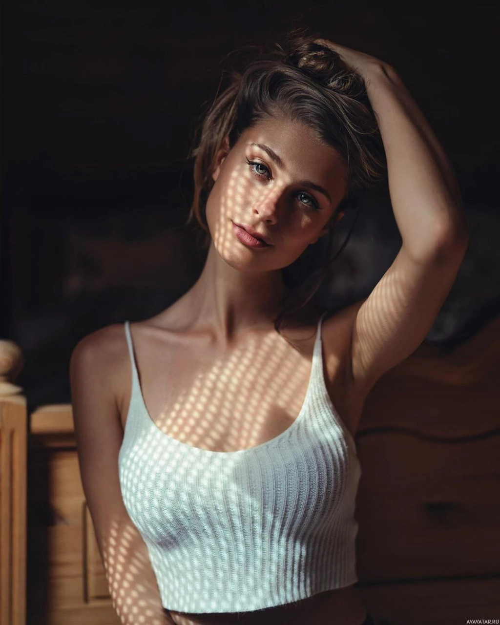 The image shows a woman posing for the camera. She is wearing a white, off-the-shoulder top and appears to be sitting on a bed or couch with her hand resting on her hip, which suggests a casual and relaxed pose. Her eyes are looking directly at the camera, and she has