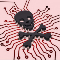 electronic components integrated into its structure, including what appears to be a microchip in the place of the brain. The skull is surrounded by an array of electronic components that could be part of a larger circuit board or a symbolic representation of technology and