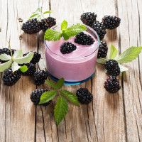 The image features a glass of what appears to be berry-flavored milk or yogurt, accompanied by an assortment of fresh blackberries and some mint leaves. This suggests that the picture may be used for food or culinary presentations, highlighting a healthy snack option with natural ingredients.