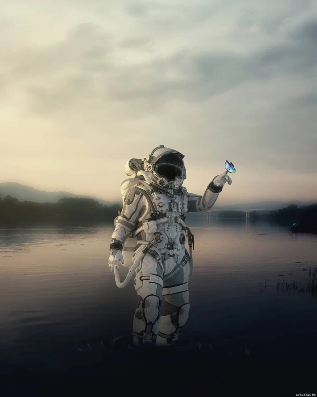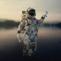 body of water reflecting the sky at either sunrise or sunset due to the soft lighting and shadows cast. On the astronaut's right hand, there appears to be an object that could be interpreted as a butterfly, which might suggest themes of life, exploration, or nature. The overall setting suggests