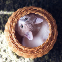 the playful nature of being in the basket suggest a cute or adorable scene often associated with pets and domestic life.