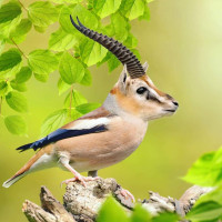 The image shows a bird with features resembling that of a small antelope. This is likely an edited or artistically modified photo intended to create a whimsical effect, where the head of a small antelope has been photoshopped onto the body of a bird. It's not a naturally occurring animal and is meant for entertainment or artistic purposes.