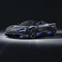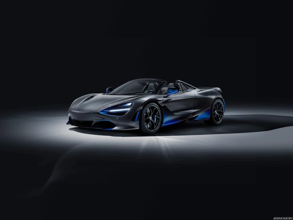 blue accents, giving it a luxurious and sporty appearance. There are visible elements such as aerodynamic side skirts, large