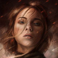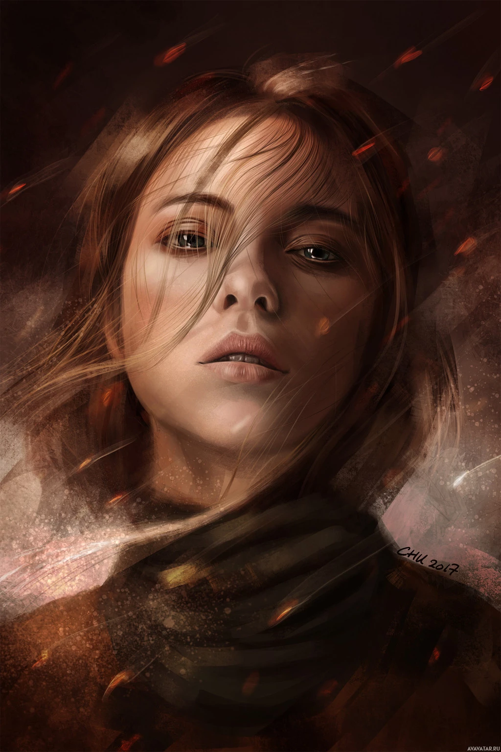 short hair and is wearing what appears to be a scarf or piece of clothing draped around her neck, suggesting a cooler climate or perhaps a historical context for the artwork. The background is slightly blurred but gives off a warm tone, contrasting with her cooler
