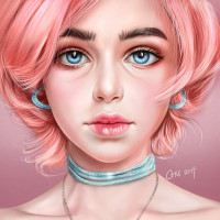 rosy cheeks which gives her a soft and youthful appearance. She has a necklace around her neck and is wearing earrings. The artwork is done with a detailed and realistic style.