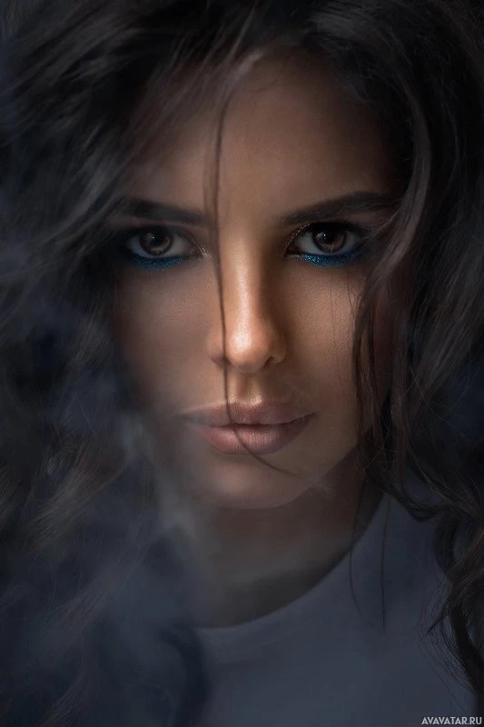 brown hair, looking slightly away from the camera with a neutral expression. Her makeup is done in shades that enhance her features, and she has a hint of blue eyeshadow around her eyes, which gives her