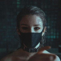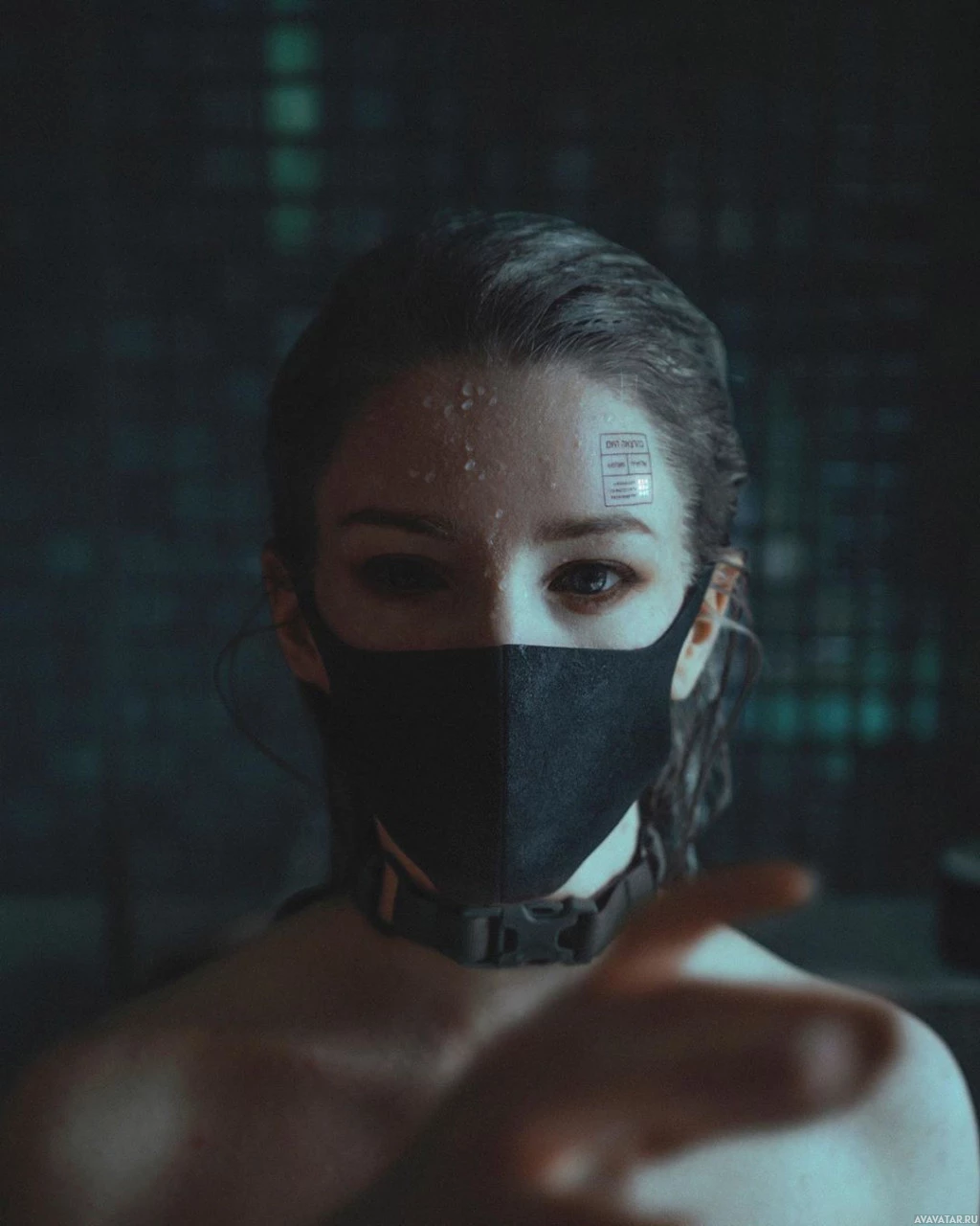 dark hair and is wearing a mask over her mouth, which could indicate a concern for health or a specific context where masks are required. Her gaze is intense and focused, and she appears to be indoors, possibly in a room with industrial lighting that casts