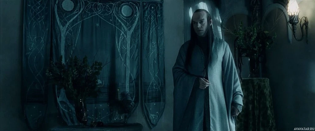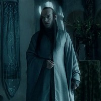 a white robe and holding a staff, which suggests they may be portraying a character from Middle-earth, such as Gandalf from "The Lord of the Rings" series. The background shows an interior with stone walls, arches, and decorations that might indicate a setting from a fantasy or