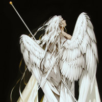 fantasy character has long, flowing white hair and is adorned with large wings that extend from its shoulders. The figure holds what appears to be a staff or weapon in one hand, suggesting a protective or magical role. The clothing is detailed and textured, giving the impression of a garment made from feathers or similar