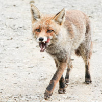 The image shows a fox walking along a path. It appears to be in a natural environment with dirt and rocks around. The fox is looking at something, possibly off-camera, giving an impression of curiosity or concern.