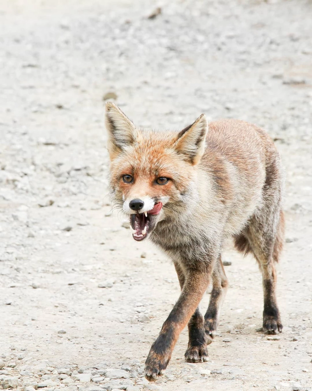 Картинка показывает лису, идущую по тропинке. Похоже, что он находится в естественной среде с грязью и камнями вокруг. Лиса смотрит на что-то, возможно, за кадром, создавая впечатление любопытства или беспокойства.