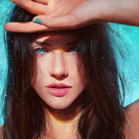 brown hair, lying on her back in a pool of water. She appears to be looking up towards the sky, perhaps enjoying the sun or simply posing for the photograph. Her pose and expression suggest