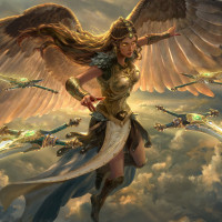 The image depicts a fantasy-themed illustration. In the center of the image, there is a character with angelic features, such as wings and an ethereal appearance. She is holding a sword in her right hand, which suggests she might be a warrior or guardian. Her armor and weapons appear to be inspired by classical designs often found in