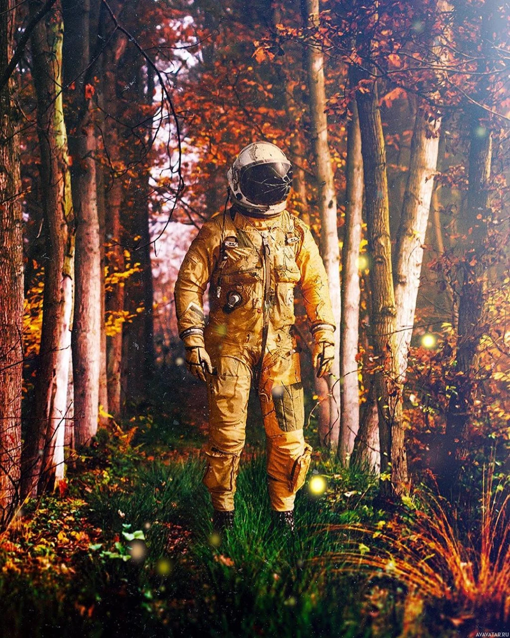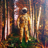 The picture shows an astronaut standing in a forest filled with