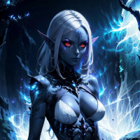 a female character that appears to be designed in a fantasy style, reminiscent of characters commonly found in role-playing games or the Dungeons & Dragons universe. She has pale skin and pointed ears, which are characteristic features of drow, a fictional race known from such