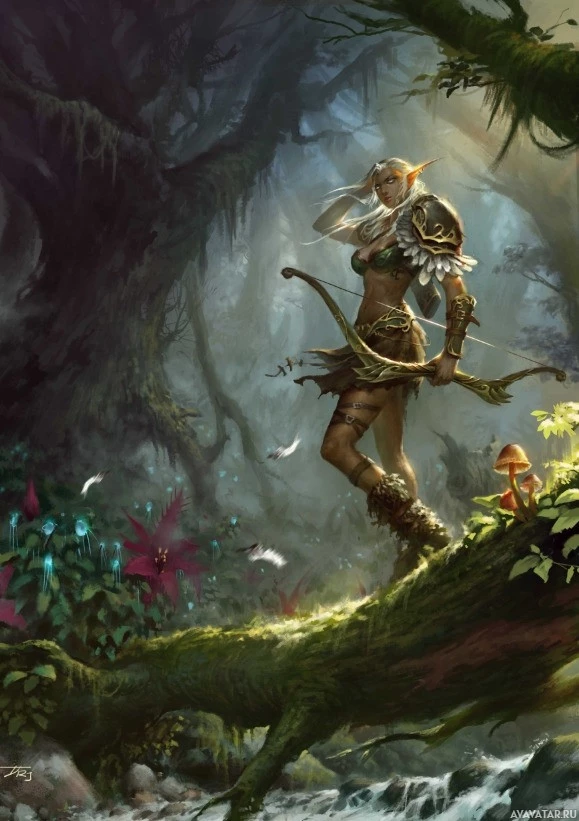 a fantasy scene featuring an elf woman. She is standing on a mossy ledge or branch, holding a bow and arrow in her hands. The background suggests a lush,