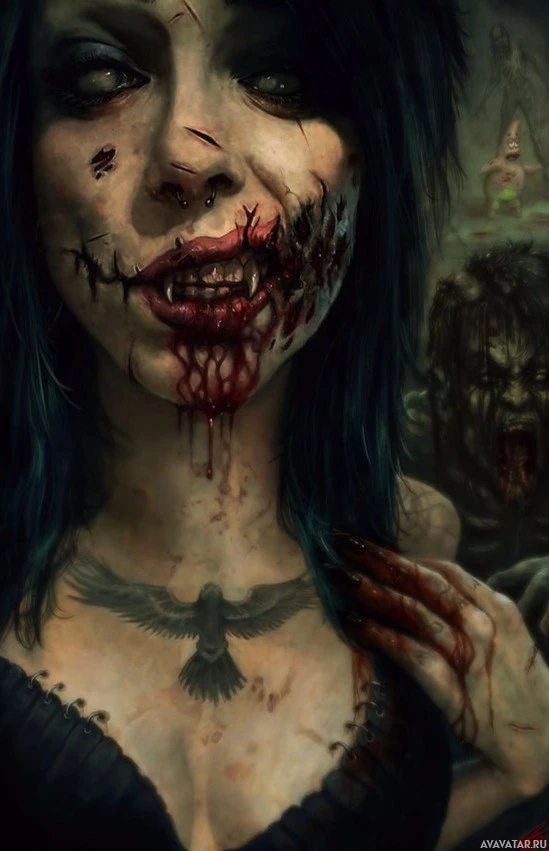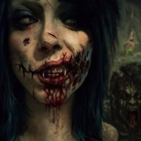 eye makeup, and her lips are bloodstained. Her eyes are red-rimmed, and she appears to be covered in blood, suggesting that she might be undead or involved in