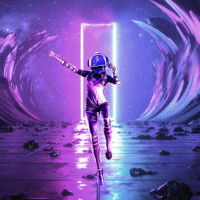 The image features an astronaut, who appears to be in a space-themed environment. The setting is futuristic and colorful, with