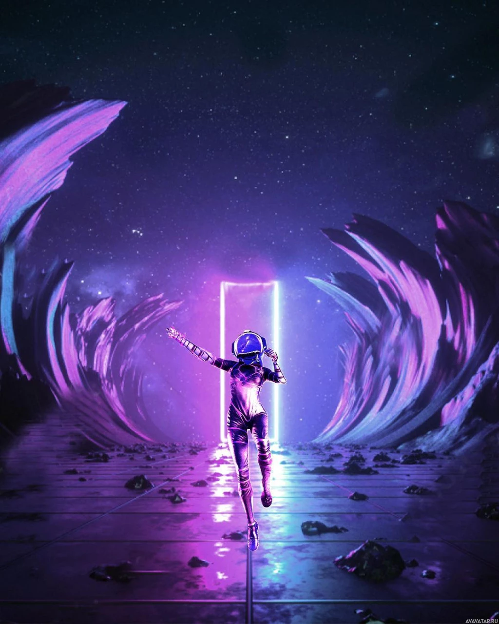 nebulous clouds and stars in the background. The astronaut is shown in