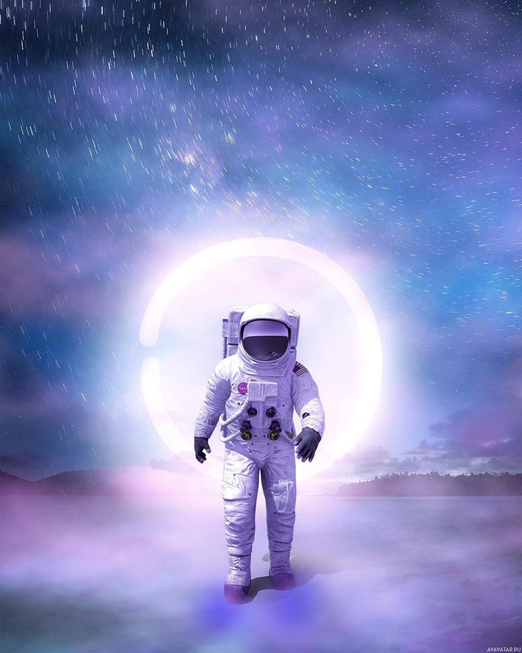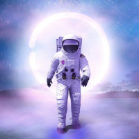 The image features an astronaut standing on