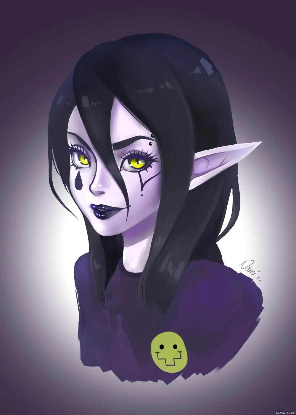 dark hair and a stylized design that could be interpreted as a painting or digital artwork in a dark, moody color palette with purples and blacks dominating the background. The character is wearing what looks like
