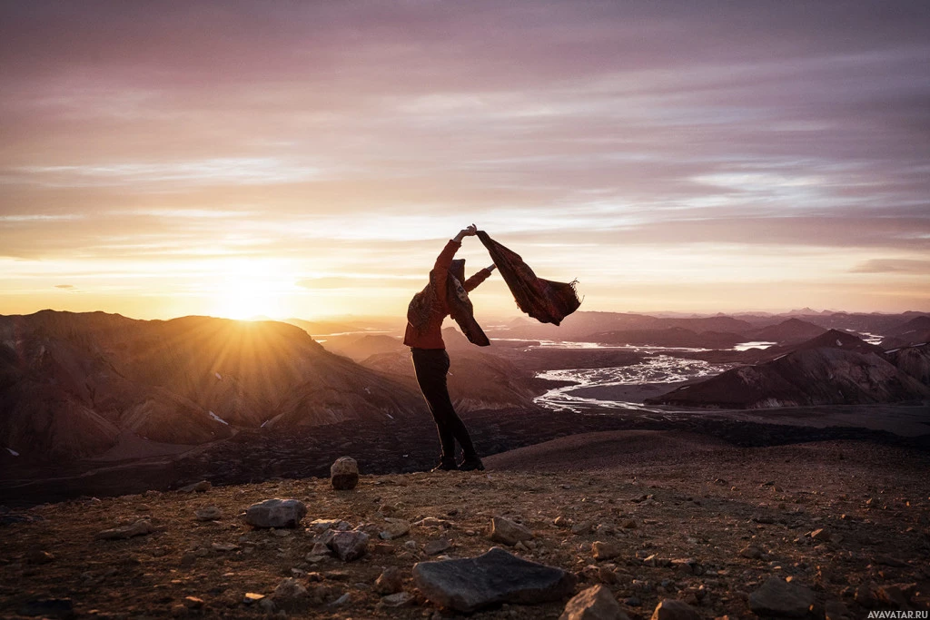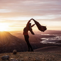 a vast landscape stretching out behind them. The individual appears to be in a celebratory pose, possibly dancing or raising their arms in the air, which suggests