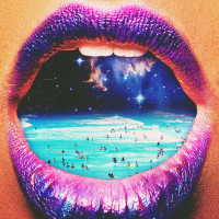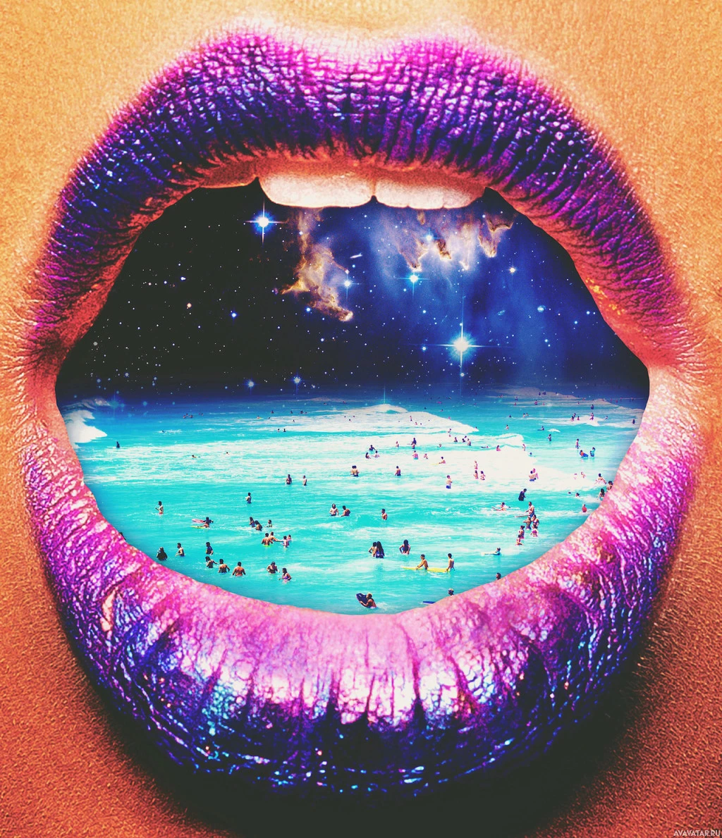 a beach scene at sunset, complete with a starry sky above and a shoreline below, populated by small figures that could be people enjoying the beach. This creative composition juxtaposes the person's lips with the picturesque beach scene, creating a surreal and imaginative