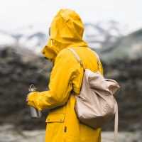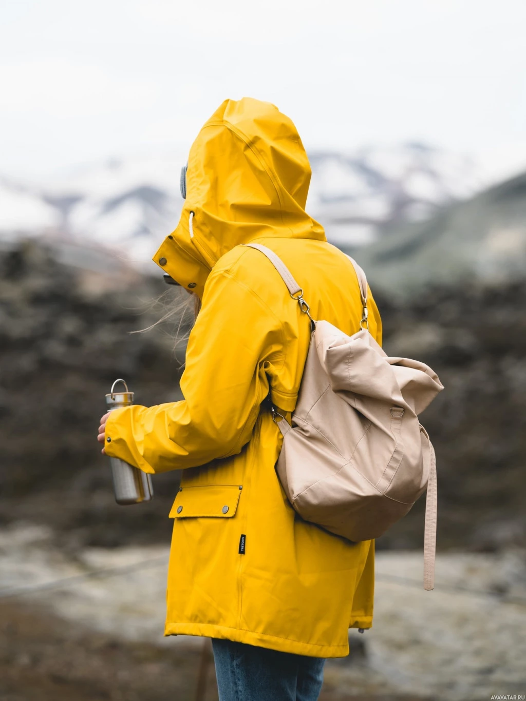 yellow raincoat and carrying a backpack. They have the hood up on their head, indicating that it might be raining or they are trying to stay dry. It's likely that this individual is engaging in some
