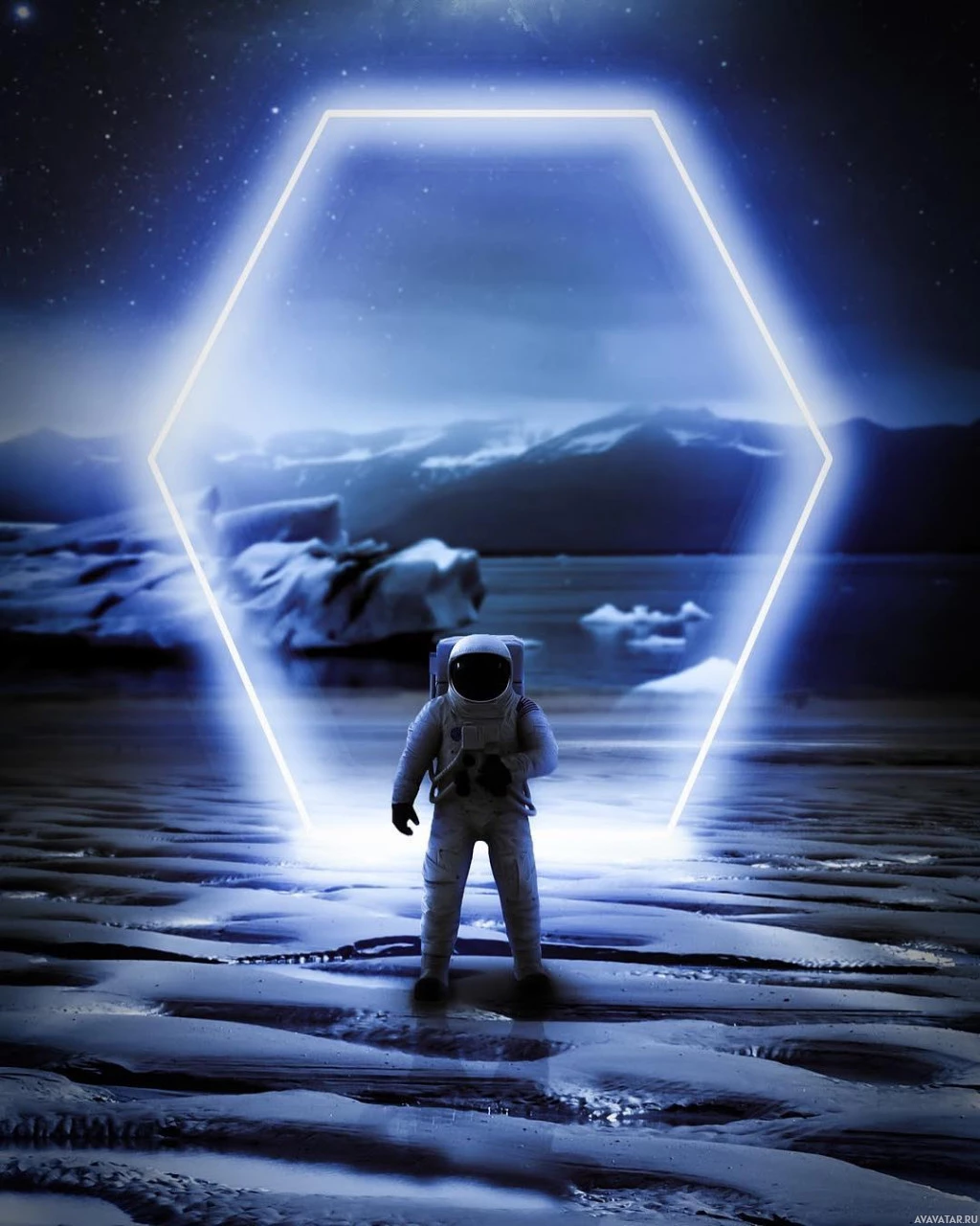 body of water. The astronaut is wearing a spacesuit with the helmet off, looking towards a large, glowing, blue hexagonal portal or entrance that leads into a mountainous landscape under