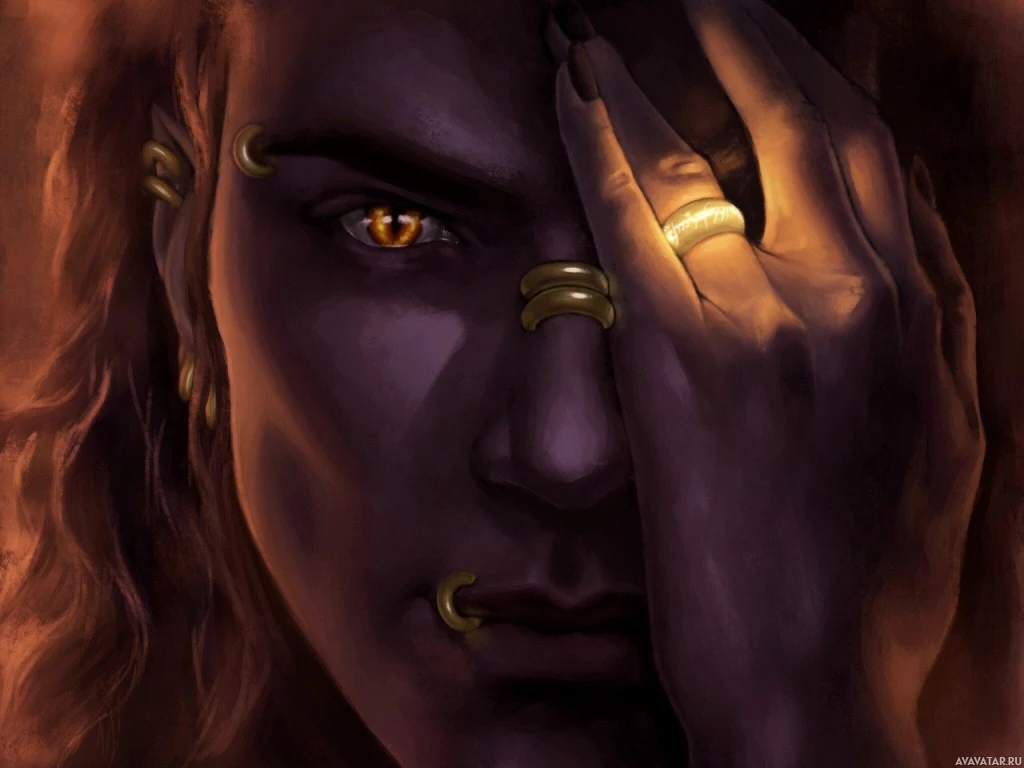 the fantasy world of Middle-earth. This character is wearing rings on their fingers, and they are looking downwards, holding their face as if in