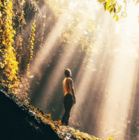 green plants growing on the rocks inside the cave, which adds to the lush, natural atmosphere of the scene. The person appears to be in