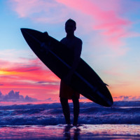 The image shows a person silhouetted against the backdrop of a vibrant sunset or sunrise. They are holding a surfboard, suggesting they may be preparing to go surfing. The reflection of the person and their board on the wet sand creates an interesting visual effect. The scene is set at the beach with the sea in the background.