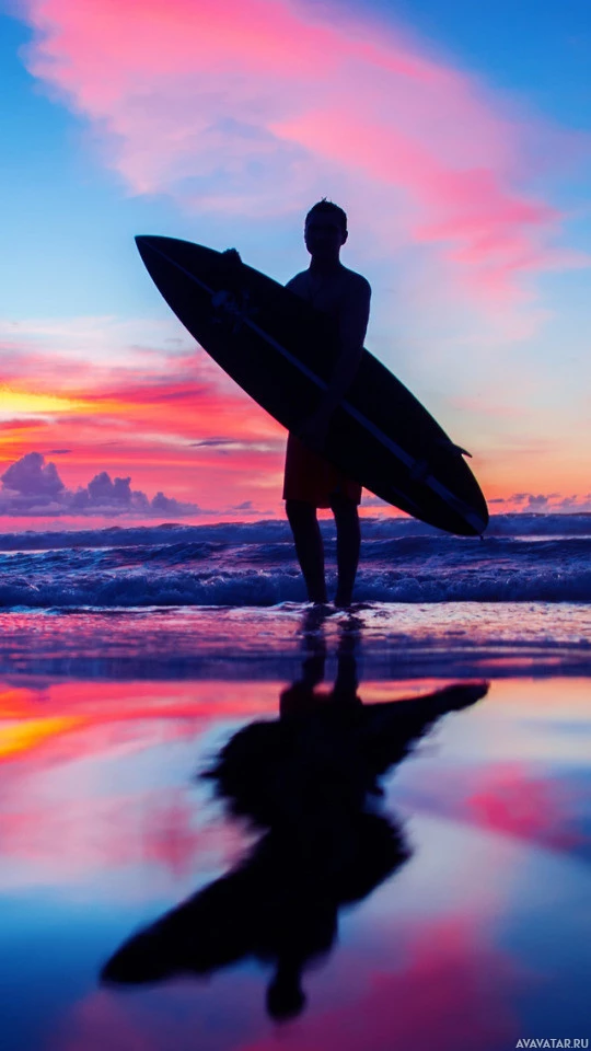 Картинка показывает человека, силуэтом на фоне яркого заката или восхода солнца. Они держат доску для серфинга, предполагая, что они могут готовиться к серфингу. Отражение человека и его доски на мокром песке создает интересный визуальный эффект. Действие происходит на пляже с морем на заднем плане.