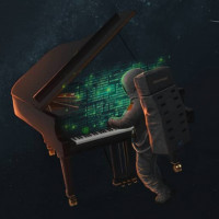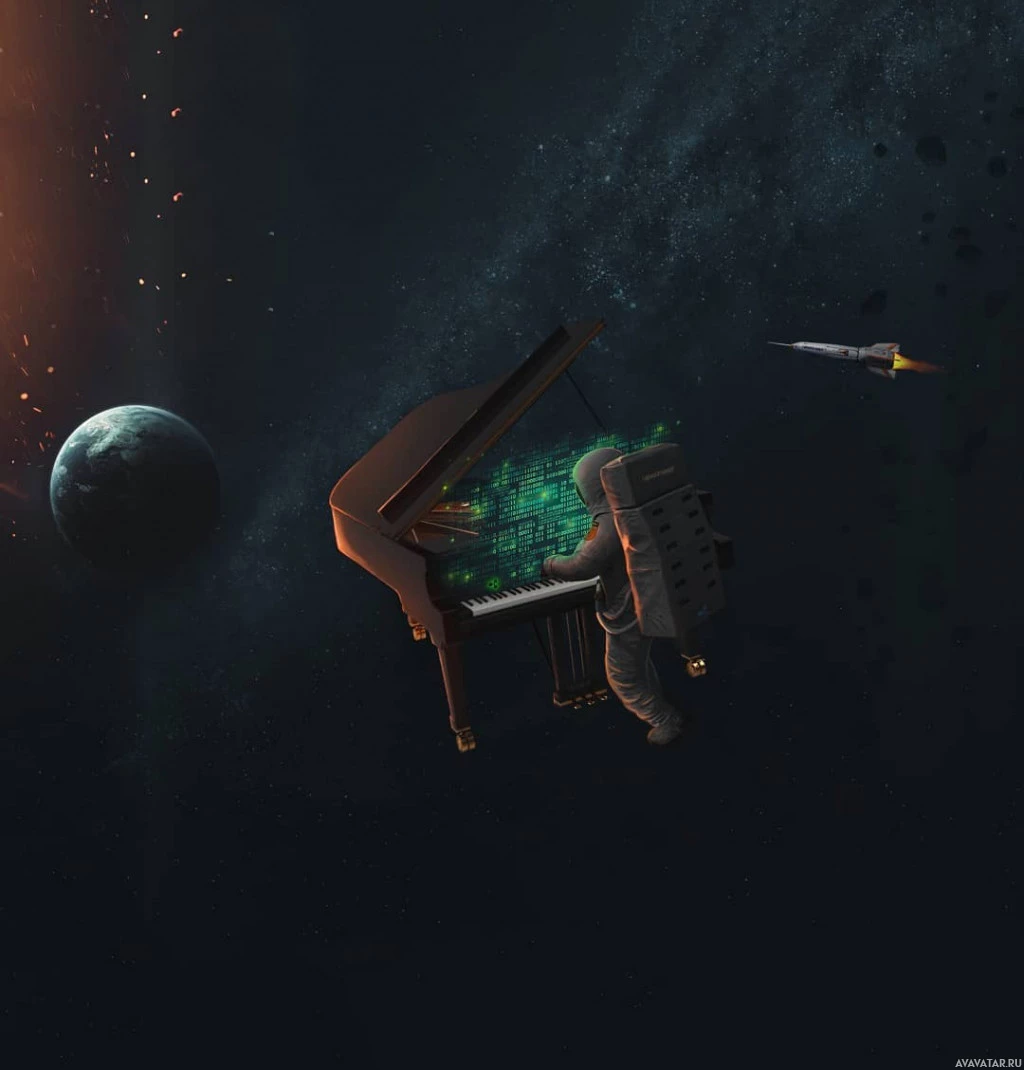The image depicts an astronaut floating in space with a piano attached to the back of their suit. The astronaut appears to be playing the piano, and there are