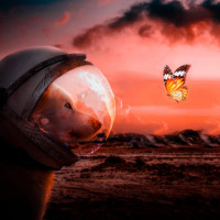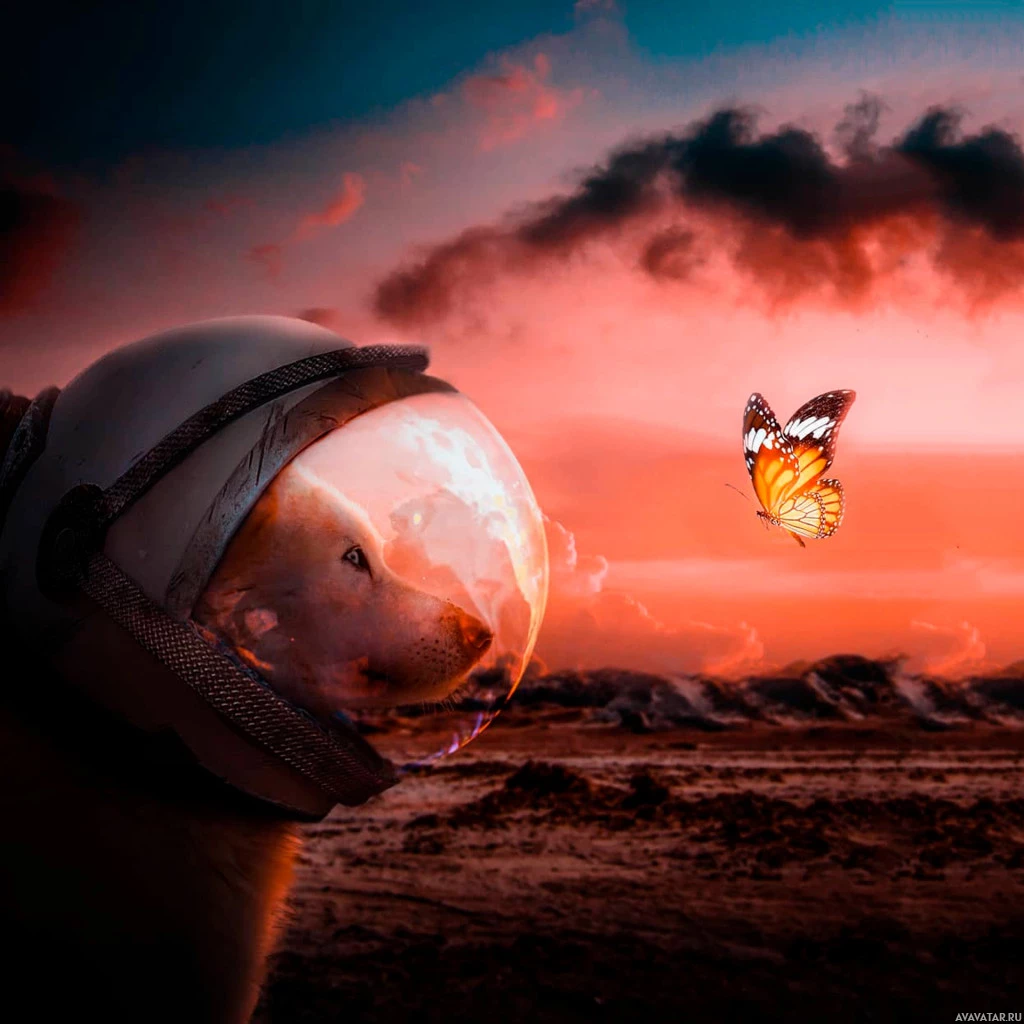 a space suit peering out of a helmet. The dog is wearing a helmet as well and appears to be looking at the butterfly that is flying in the foreground of the image. The setting appears to be on a planet with a reddish sky during sunrise or sunset, indicating a scene that could possibly take place on Mars given the color scheme and the presence of