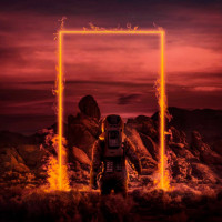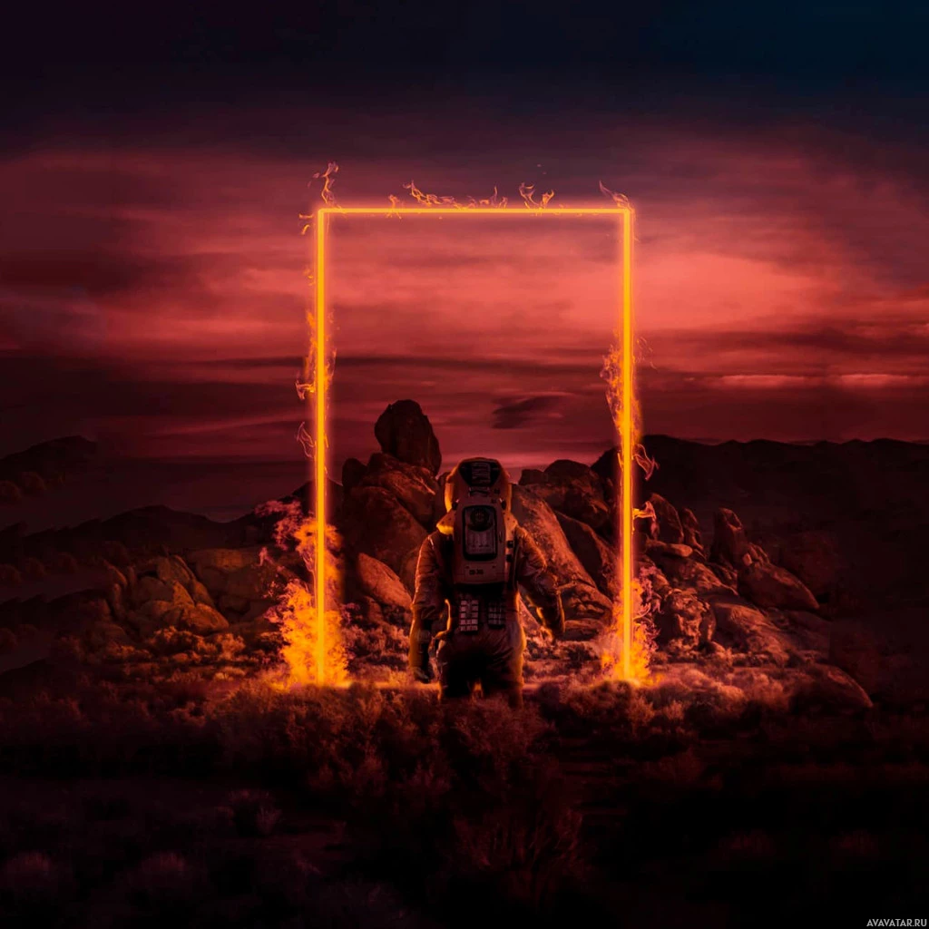 a desert landscape at what appears to be either sunrise or sunset, given the warm and golden light. In front of the astronaut is a large frame with a fire burning inside it, creating an intense