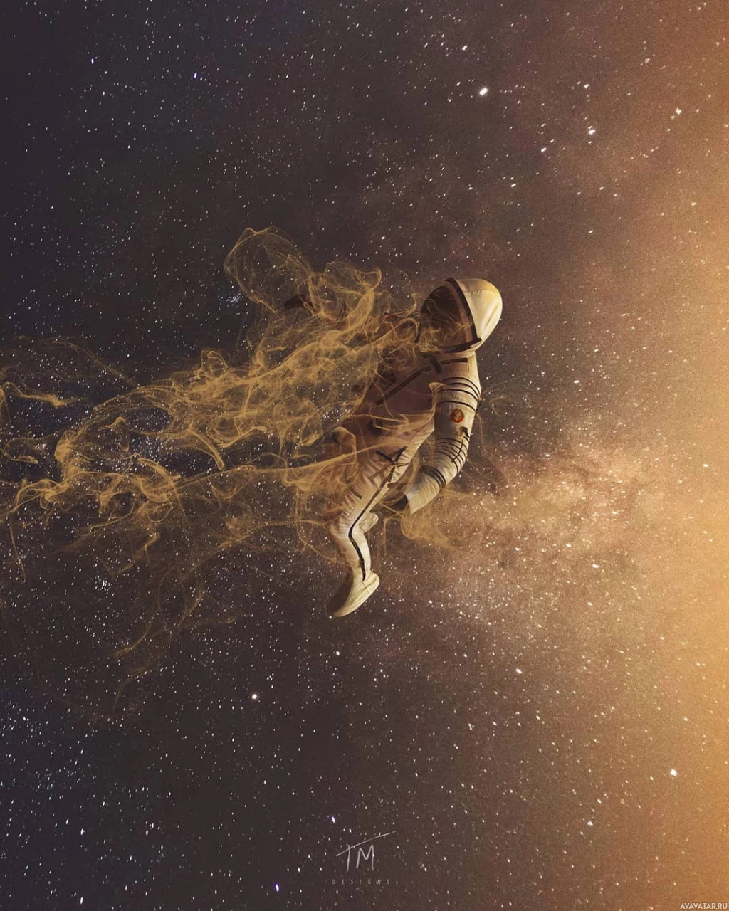 The image depicts an astronaut in space, surrounded by a cloud of vapor or smoke. The background features stars and nebulas, giving the impression of being in the cosmos. It's a creative piece that combines elements from outer space with dramatic effects to suggest movement or change.