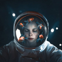 human face under the helmet, there is a fish's head, which includes its mouth and eyes, creating an unusual and surreal effect. The background appears to be dark with some stars or lights twinkling, suggesting