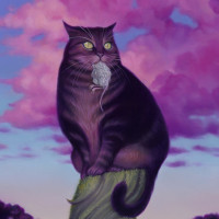 The image depicts an illustration of a cat sitting atop a tree stump, with its eyes glowing brightly. The cat is holding what appears to be a mouse in its mouth. The background features a purple sky with clouds. This image is likely intended for an audience interested in animals or fantasy art.
