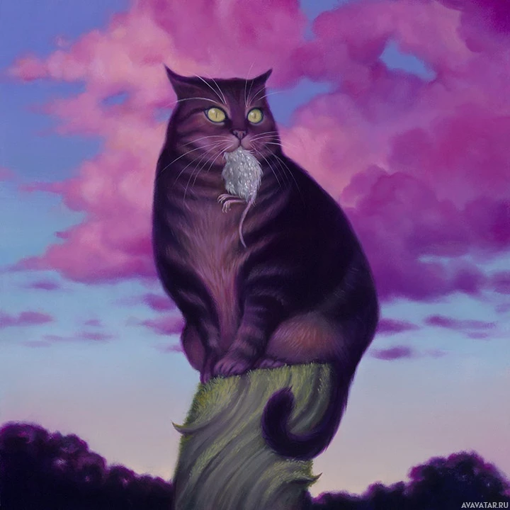 На картинке изображена кошка, сидящая на вершине пня дерева, с ярко светящимися глазами. Кошка держит во рту то, что кажется мышью. На заднем плане фиолетовое небо с облаками. Этот образ, вероятно, предназначен для аудитории, интересующейся животными или фэнтезийным искусством.