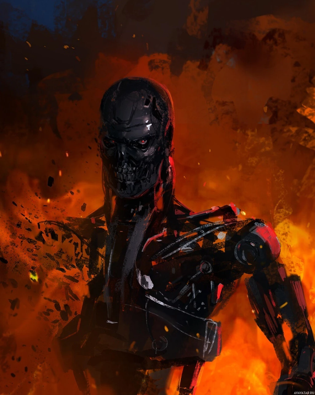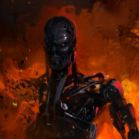 The image depicts a character from the "Terminator" franchise, known as a Terminator. This robotic endoskeleton is typically portrayed with