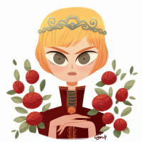 blonde hair and is wearing a red outfit with what seems to be a royal or regal accessory on their head, possibly suggesting they are a queen or noble figure. They are surrounded by